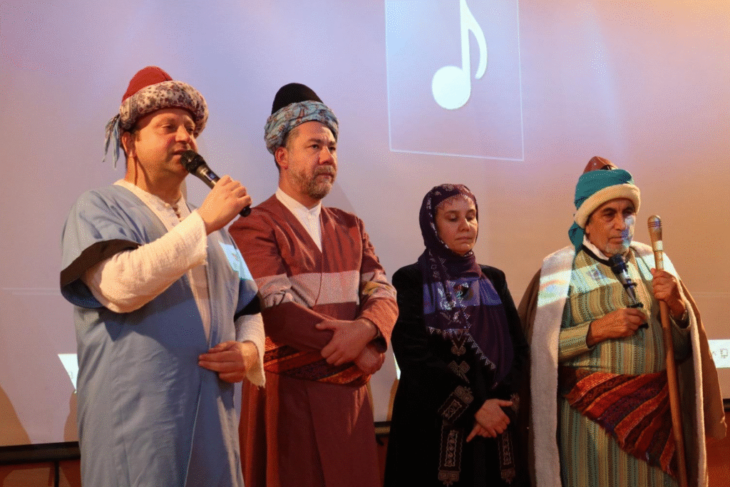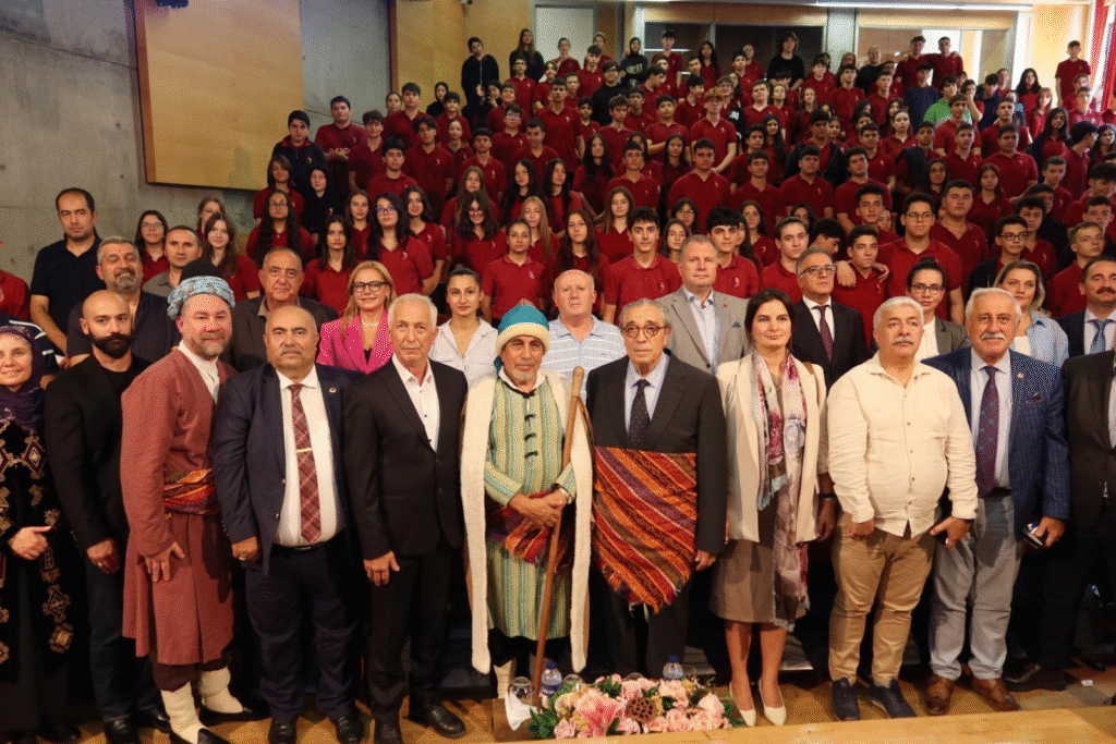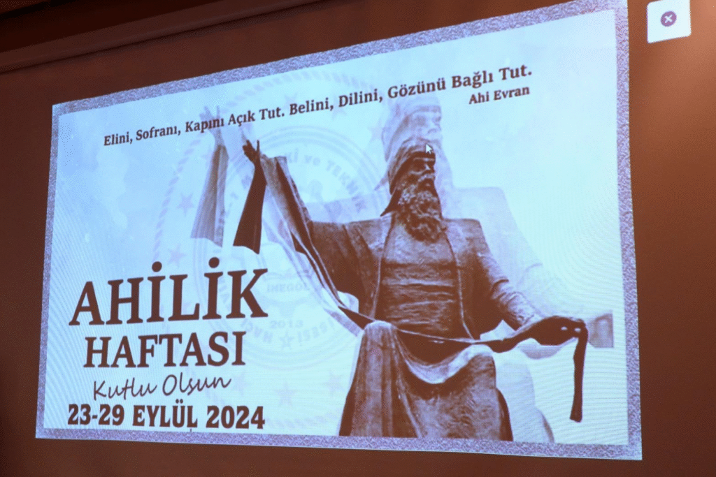 Ahi Kültürünü Araştırma ve Eğitim Vakfı temsilcilerinin sahneye koydukları gösteriden sonra, geçen yılın Ahi Babası Süreyya BALKAÇ; 2025 yılı Ahisi seçilen Alparslan BALOĞLU ’na Şed kuşattı.